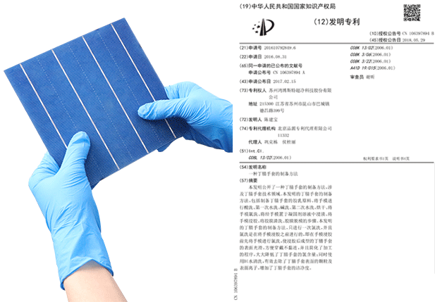 手套經過特殊工藝處理,通過驗證將手套放置氮氣柜當中80H,手套接觸產品無任何氧化情況,經權威機構檢測氯元素及硫元素完全符合接觸電池片標準,且不會在電池片上面留下任何指印。